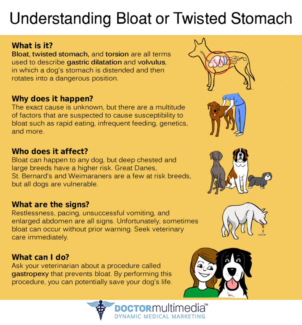 If the condition persists, the stomach continues to fill with gas and twists and progresses from simple gastric dilatation or Bloat to GDV. With no release, the stomach continues to expand and twist, cutting off the blood supply. At the same time, pressure is placed on internal organs, making it difficult for your dog to breathe and creating a life-threatening emergency where surgery and immediate veterinary care are needed.